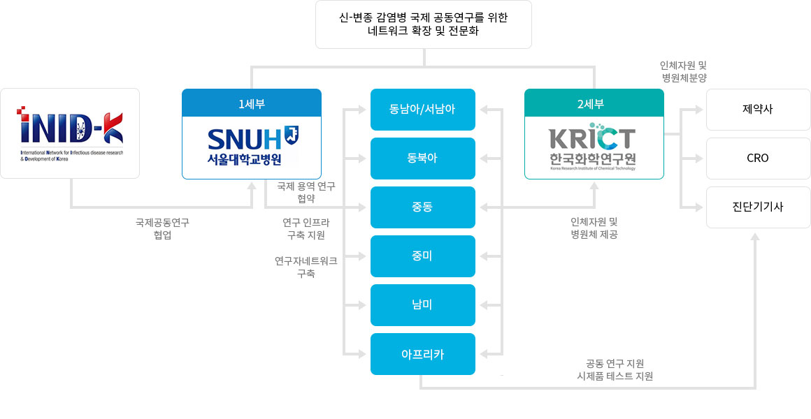 2020년 11월에 시작된 ‘고위험 감염병 자원 확보 국제 네트워크 고도화 및 활용’, INID-K(International Network for Infectious Disease Research & Development of Korea) 과제는 2024년까지 국제 협력, 자원 확보 및 연구 지원에서 주목할 만한 성과를 거두었습니다. 이를 인정받아 과학기술정보통신부 바이오•의료기술개발사업 정책지원 과제로 선정되어2025년 4월부터 네트워크 외연 확대와 연구 지원 체계 고도화에 집중하고 있습니다.